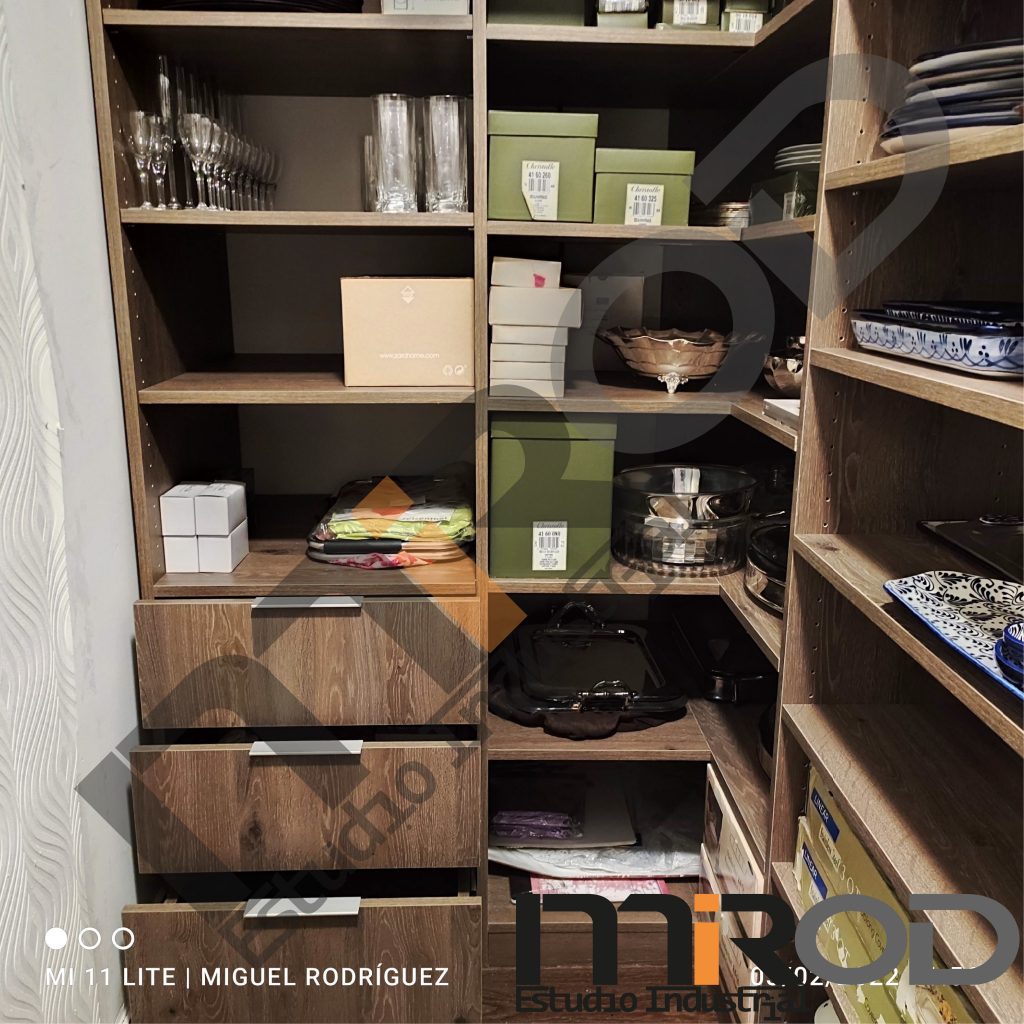 Closet para vajillas con área para servidor. Diseñado y fabricado a medida. Laminado hidrófugo con ensamble modular y sistema de tramos ajustables. Correderas importadas y sistema de tiradores de canto.
