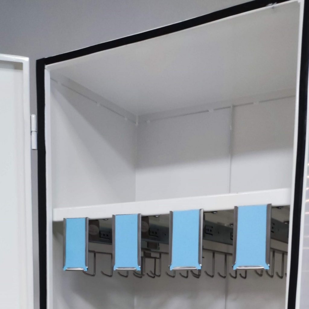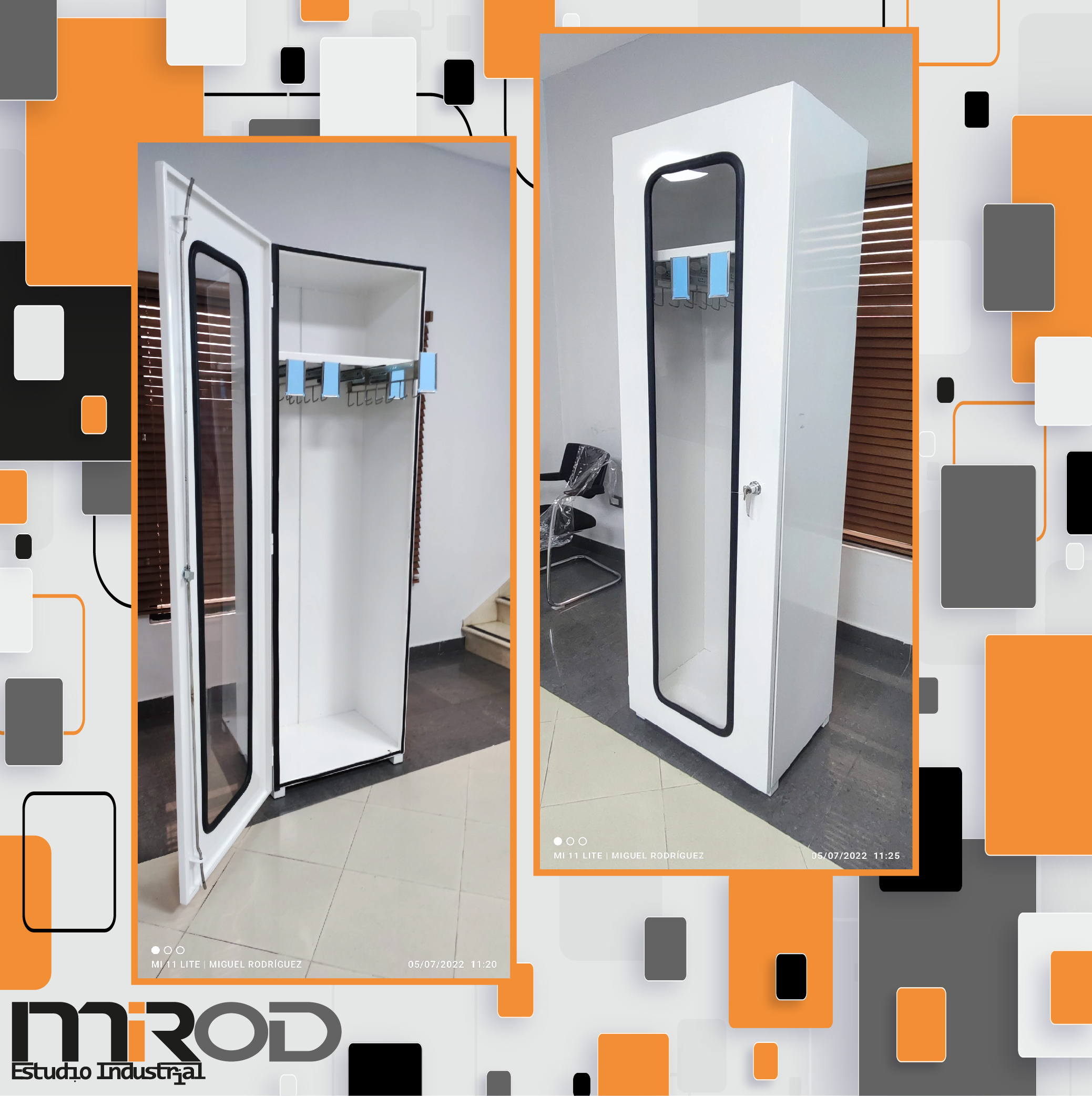 Gabinete diseñado a partir de requerimiento de almacenaje de insumos médicos específicos. Estructura en acero galvanizado con pintura electrostática blanca y sistema retráctil de suministros.
