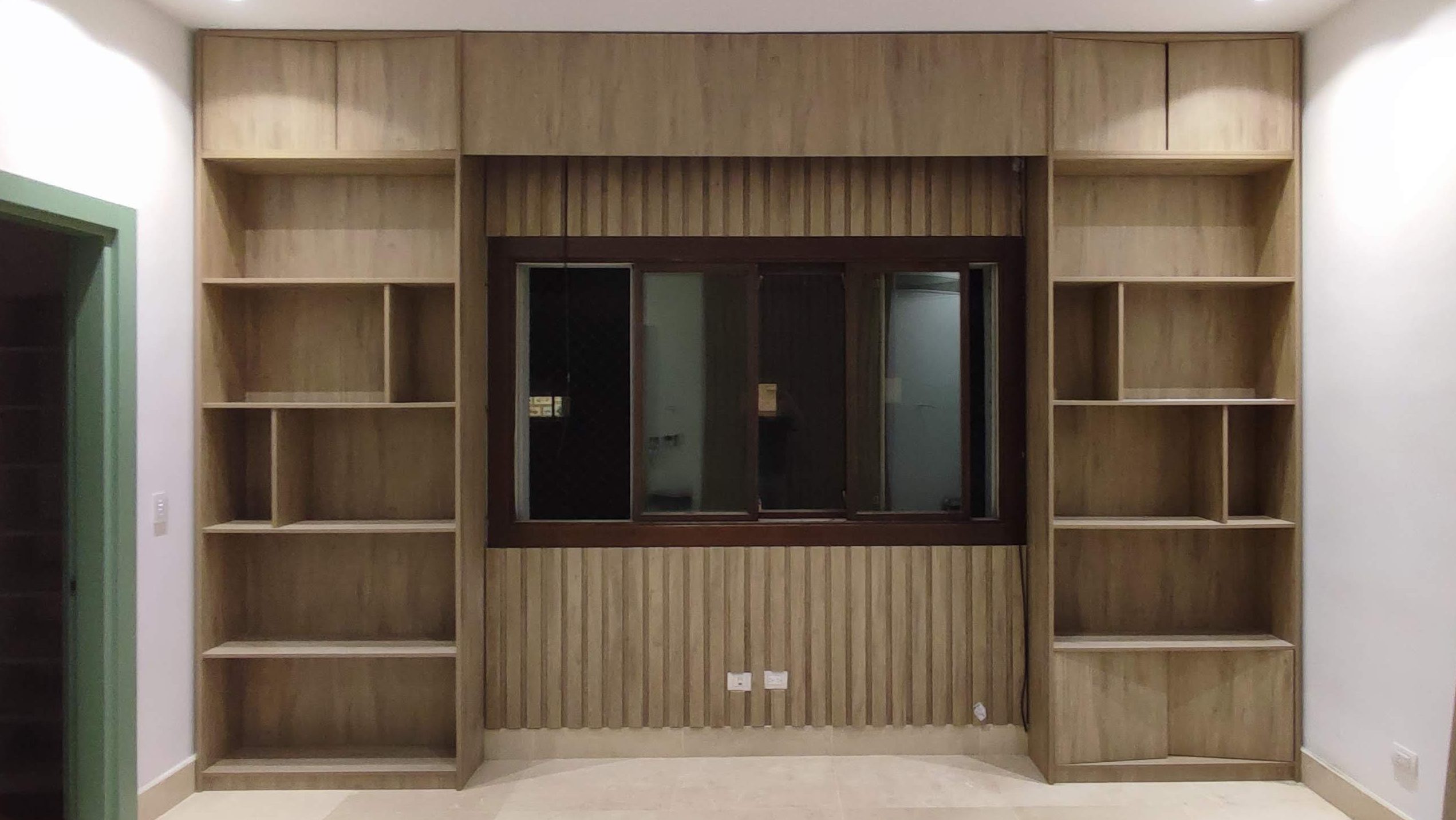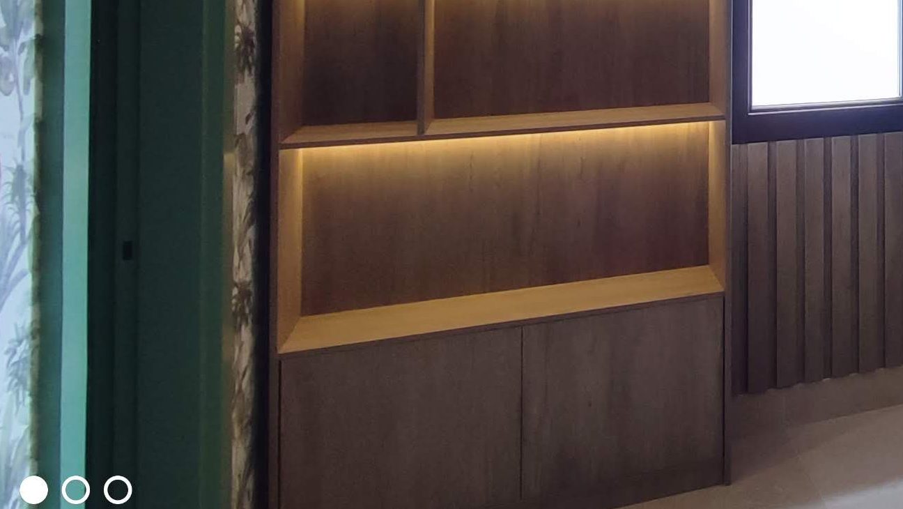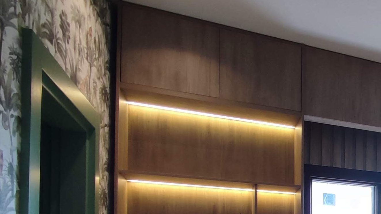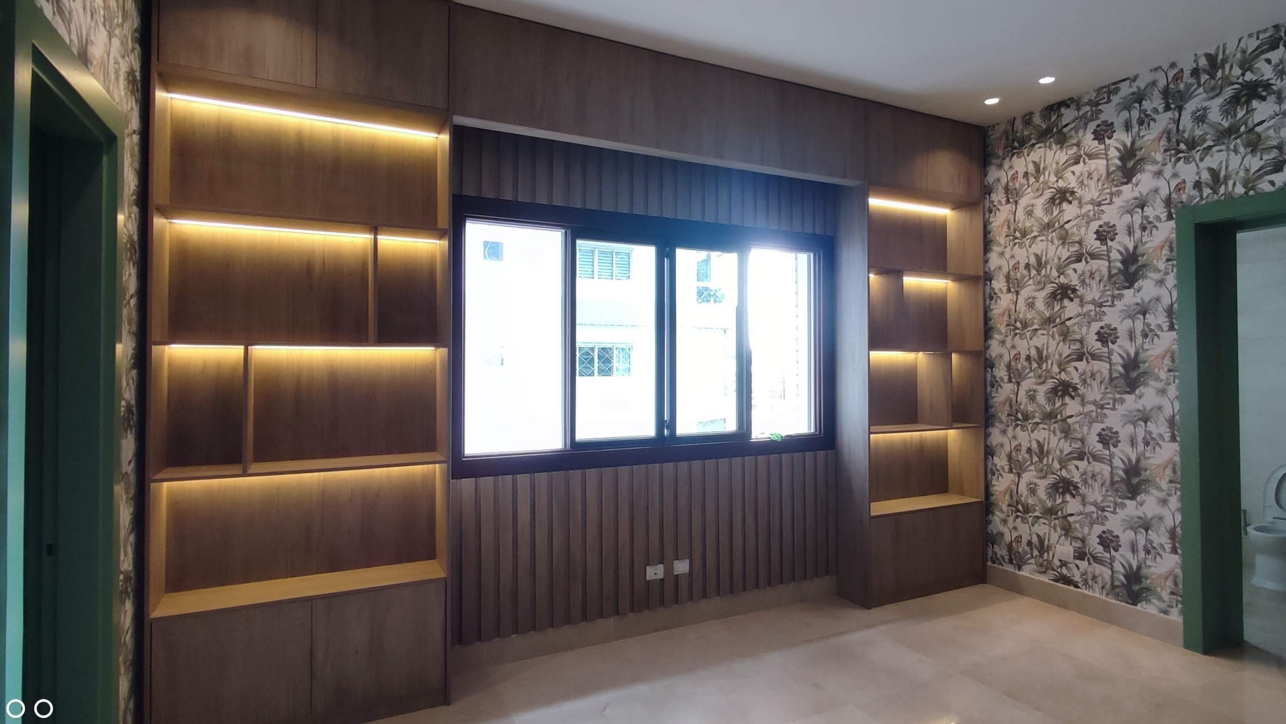 Mobiliario residencial diseñado constructivamente a partir del diseño de ARSO Design para uno de sus clientes. Mueble de encofrado de pared con repositorio para cortina y áreas de almacén con iluminación LED.