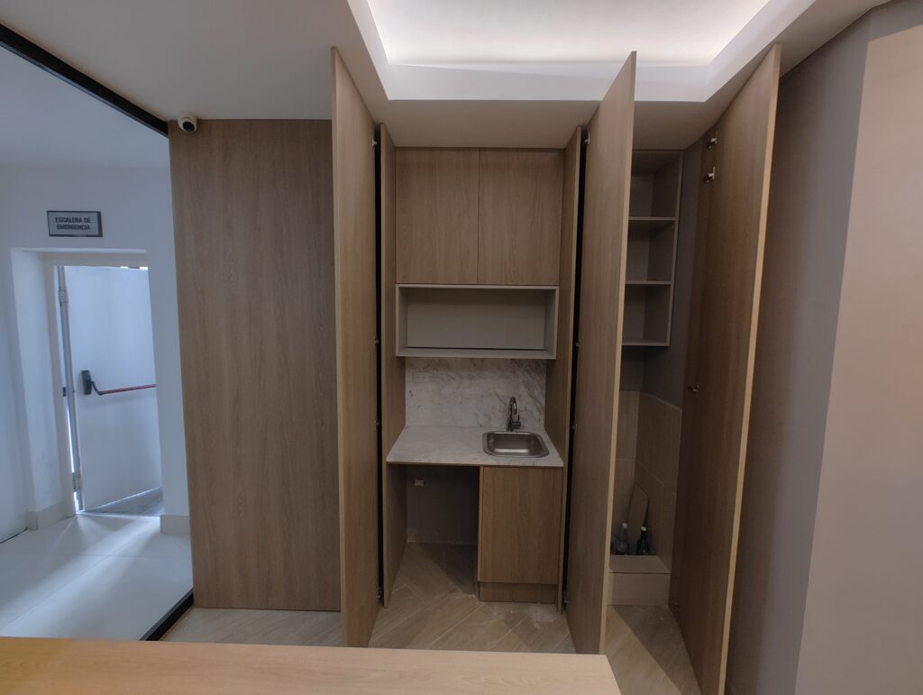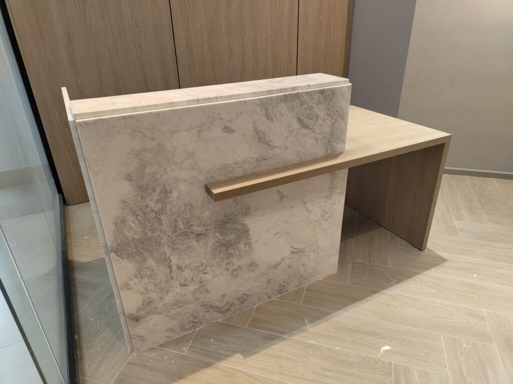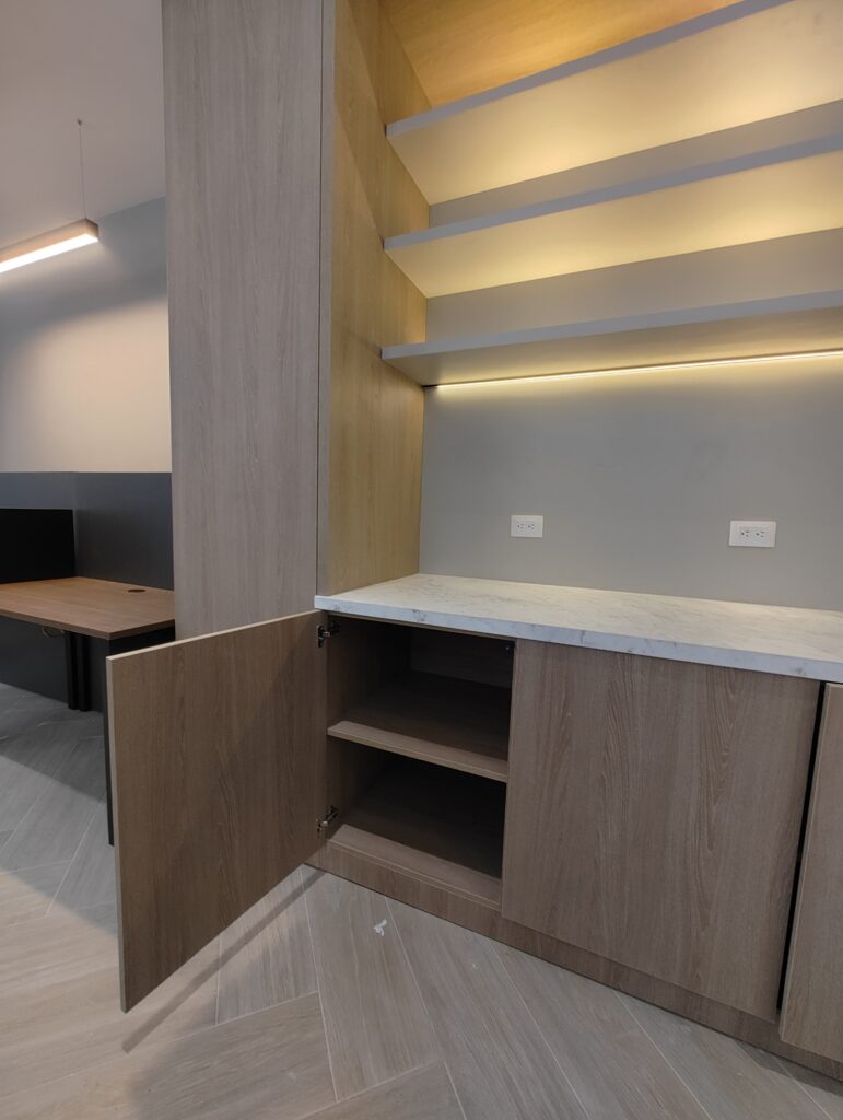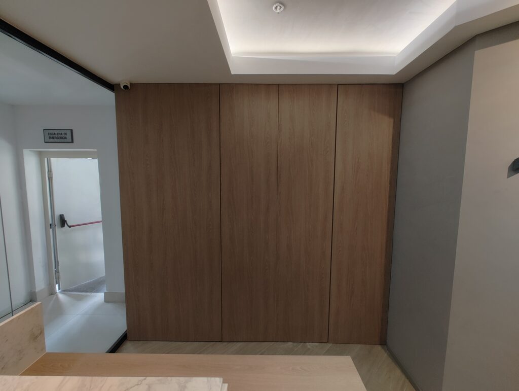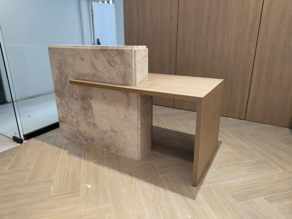 Counter personalizado en melamina con revestimiento para recepción.