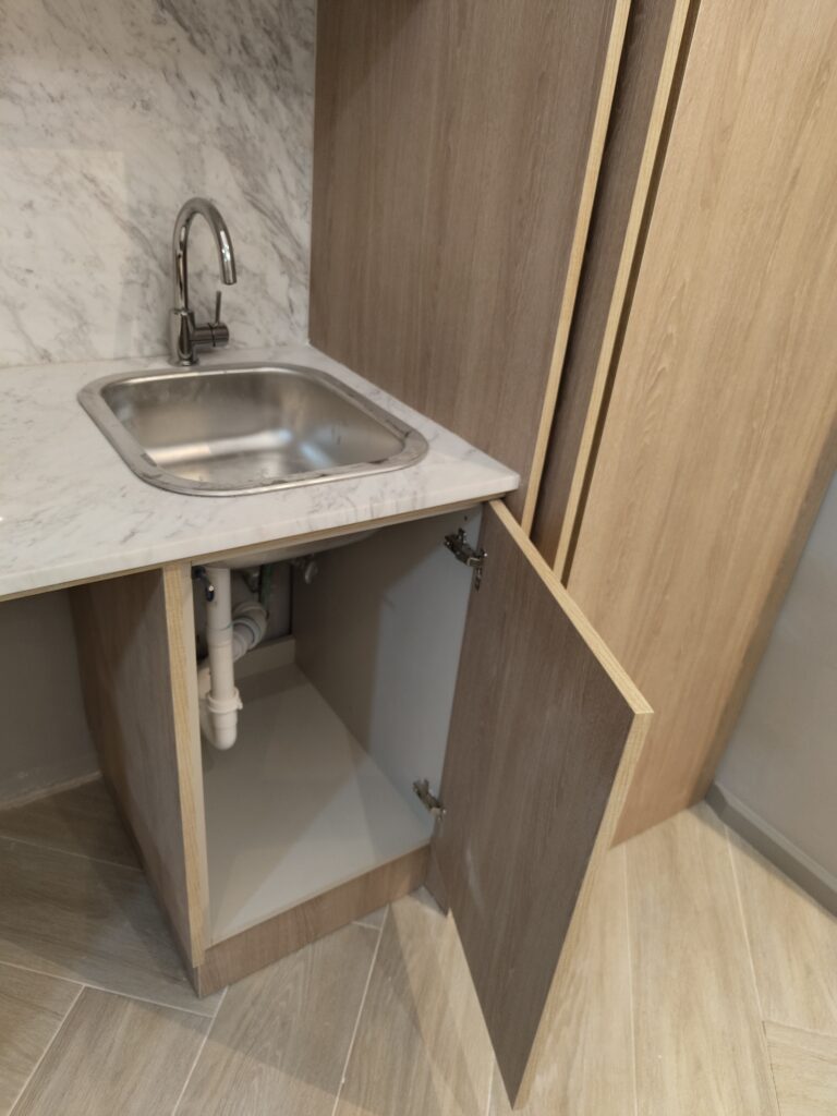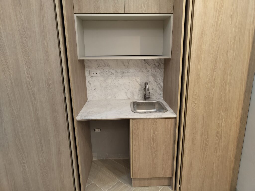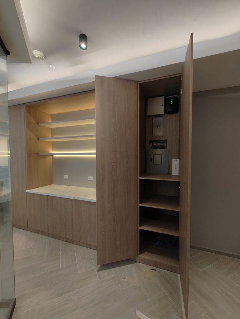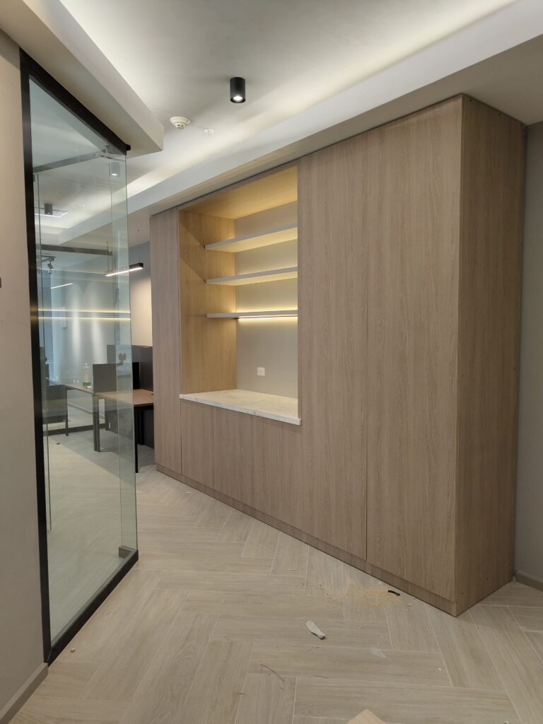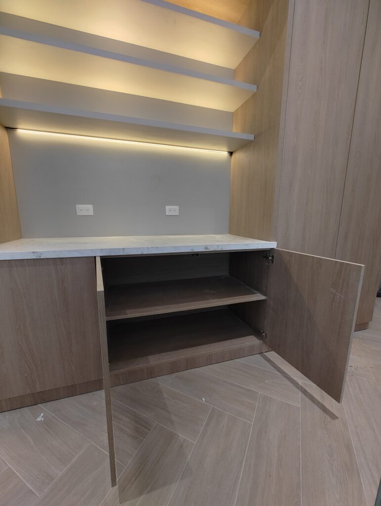 Counter personalizado en melamina con revestimiento para recepción.